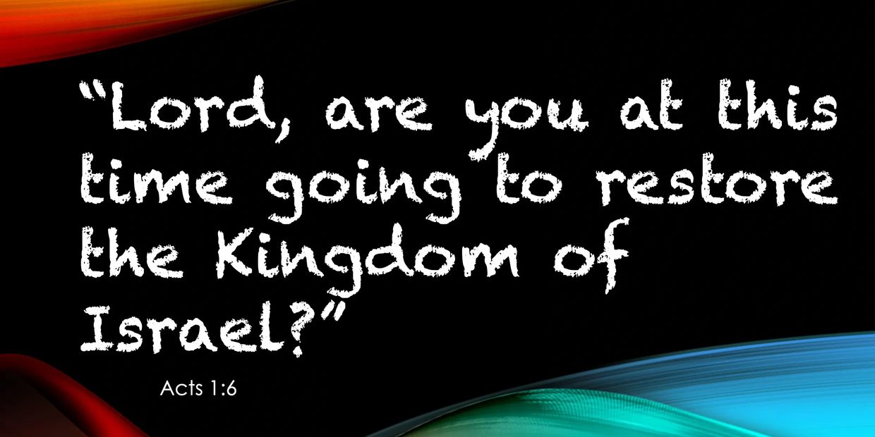 “So, when the apostles were with Jesus, they kept asking him, ‘Lord, has the time come for you to free Israel and restore our kingdom?’” (Acts 1:6) Jesus could not give them a date and time because their restoration is known only to our Father in heaven. It requires the full return of the ten tribes, the overcoming within their churches—the seven churches of Revelation filled with faulty theology, then, the removal of the veil of stupor from the Jews, their acceptance of Christ as their Savior and finally, a humble and Holy Spirit filled family of 21st century Israelites who will never depart from their God. Then and only then, will their kingdom be restored, all in time for the Millennial reign of Christ and the saints.