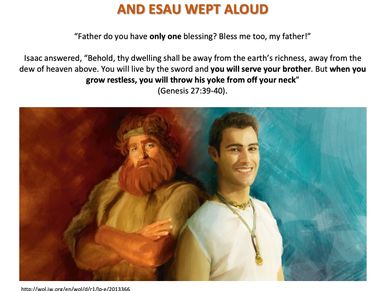 A long, long time ago there lived two boys, twins. Their names were Esau, he was first born and Jacob, born minutes later. From the time they were conceived, they fought against each other. These were the children of Isaac and Rebekah.