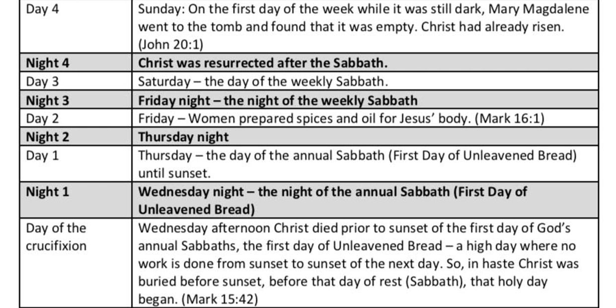 WHILE IT WAS DARK TUESDAY EVENING, SOMETIME AFTER THE PASSOVER MEAL, JESUS WAS TAKEN BY ROMAN SOLDIERS AND DURING THE NEXT DAY ON WEDNESDAY, Jesus was mocked, sentenced, beaten, and crucified. Hastily before sunset on Wednesday, before the First Day of Unleavened Bread—a holy Sabbath day, Jesus was wrapped for burial. This was not a weekly Sabbath but an annual holy day—the First Day of Unleavened Bread. “And when evening had come, since it was the day of Preparation, that is, the day before the Sabbath” (Mark 15:42).